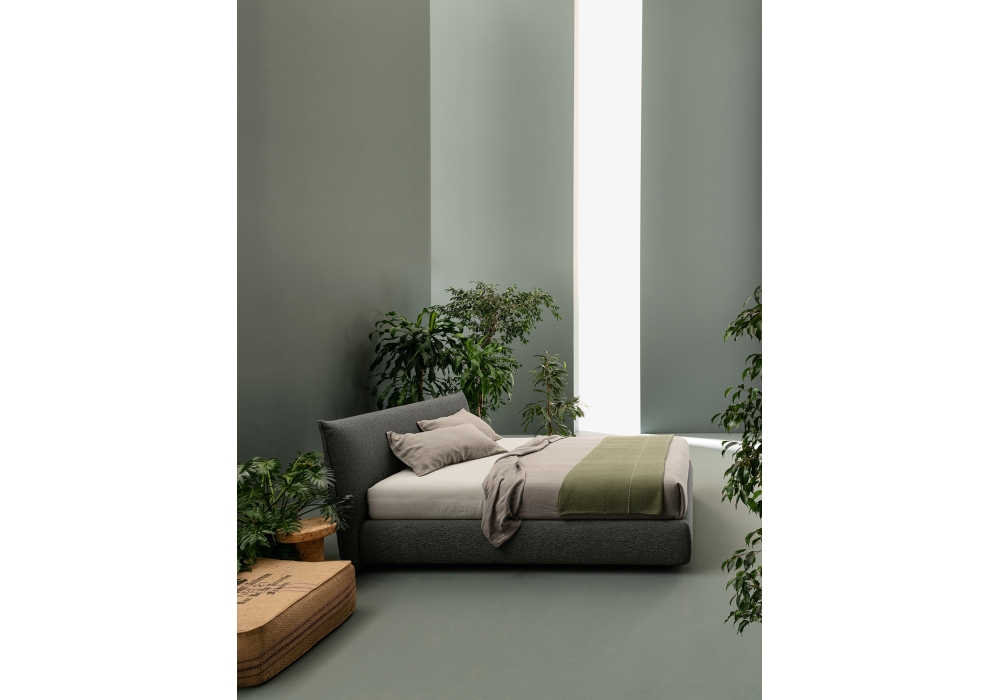 Toffee designed by R&D Caccaro for Caccaro is a bed that offers the possibility of combining the fabric of the upholstered headboard with the lacquering of the bed frame. The base can be equipped with a large box. Available in various sizes. Mattress not included.