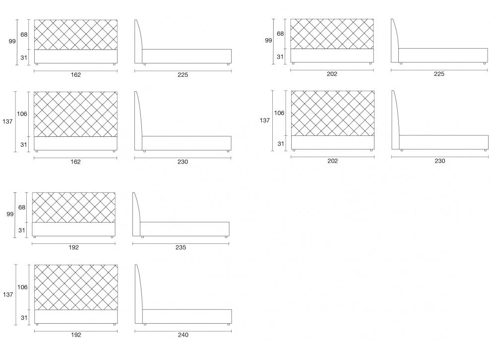 | Dimensions | 162 x 225 x H 99 cm; 162 x 230 x H 137 cm; 202 x 225 x H 99 cm; 202 x 230 x H 137 cm; 192 x 225 x H 99 cm; 192 x 230 x H 137 cm. |
