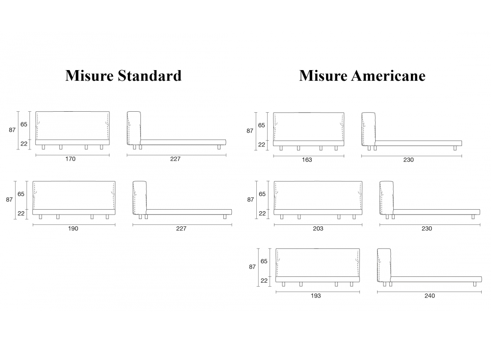 | Dimensions | 170 x 227 x H 87 cm; 190 x 227 x H 87 cm; 163 x 230 x H 87 cm; 203 x 230 x H 87 cm; 193 x 240 x H 87 cm. |