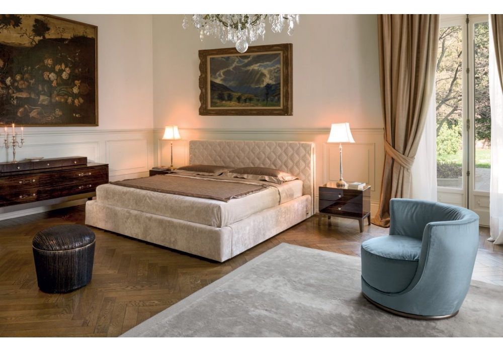 Helmut designed by Giuseppe ViganĂ² for Longhi is a bed with wooden headboard covered in high density polyurethane foam. Cover in non-removable fabric or leather with metal buttons in different finishes. Available in the version with smooth or quilted headboard.