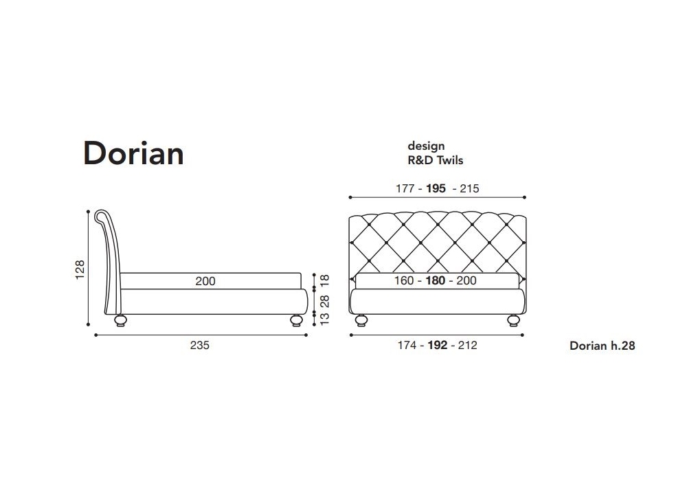 Dorian designed and produced by Twils is an upholstered bed with a 28 cm high bed frame, made in different sizes. The non-removable cover is available in various fabrics and colours. The feet (PIE48) are rounded onion shaped with Canaletto walnut finish (on request, also available in other shapes and finishes).
