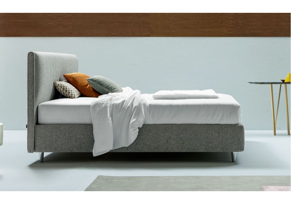 Dread designed and produced by Twils is an upholstered bed with a 14 or 25 cm high bed frame, made in different sizes. The removable cover is available in various fabrics and colours. The feet (PIE41) are squared inclined in a polished aluminum finish (on request, also available in other shapes and finishes).