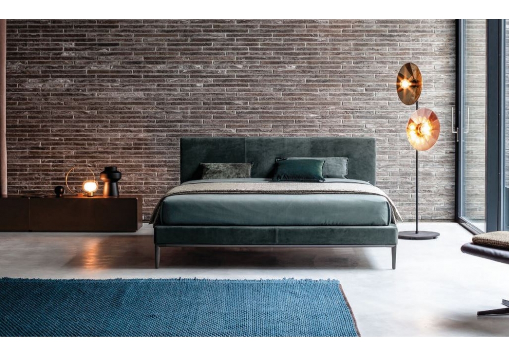 Max designed and produced by Twils is an upholstered bed with a 14, 22 or 28 cm high bed frame, made in different sizes and models. The removable cover (with the exception of the leather cover) is available in various fabrics and colours. The feet are squared in polished aluminum (PIE61), inclined in mother-of-pearl finish wood (PIE3D/PIE4D).
