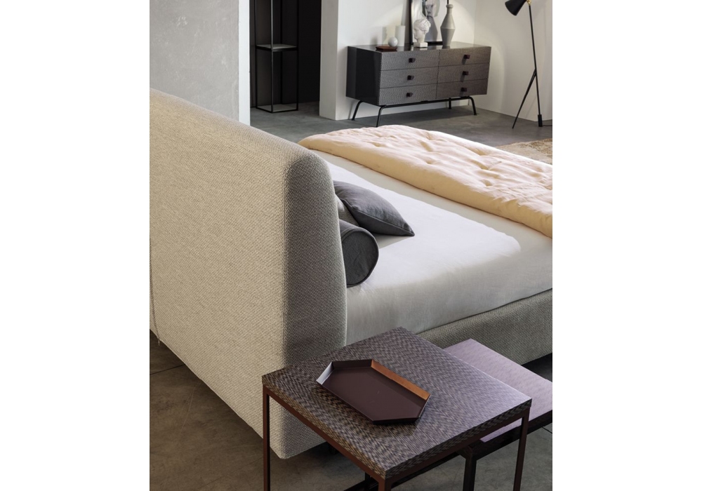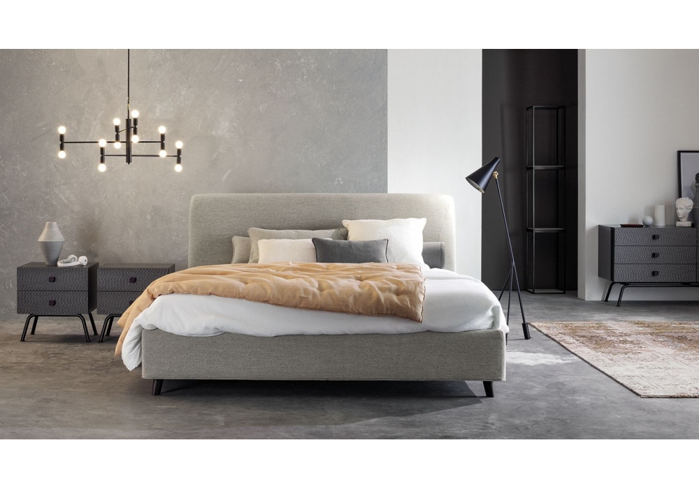 èS designed and produced by Twils is an upholstered bed with a 10 or 25 cm high bed frame. The removable cover is available in various fabrics and colours. The bed is available in different designs and sizes. The feet are in sloping wood with a mother-of-pearl finish.