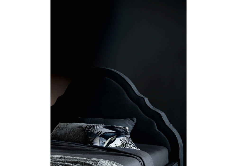 Celine designed and produced by Twils is an upholstered bed with a 28 cm high bed frame, with removable covers and available in various models and sizes. The headboard is a textile frame that recalls the classic style. The upholstery is available in numerous fabrics and colours. The feet have a mother-of-pearl finish.