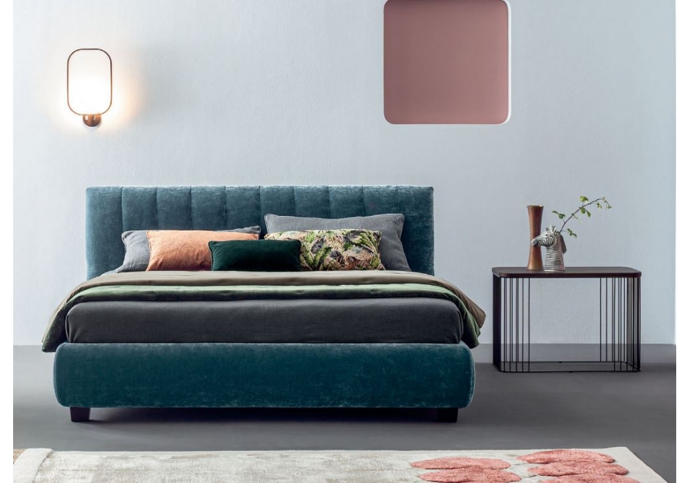 Thomas designed and produced by Twils is an upholstered bed with a 25 cm high bed frame, available in various models and sizes. The removable cover is available in numerous fabrics and colours. The feet (PIE38) have a mother-of-pearl finish.