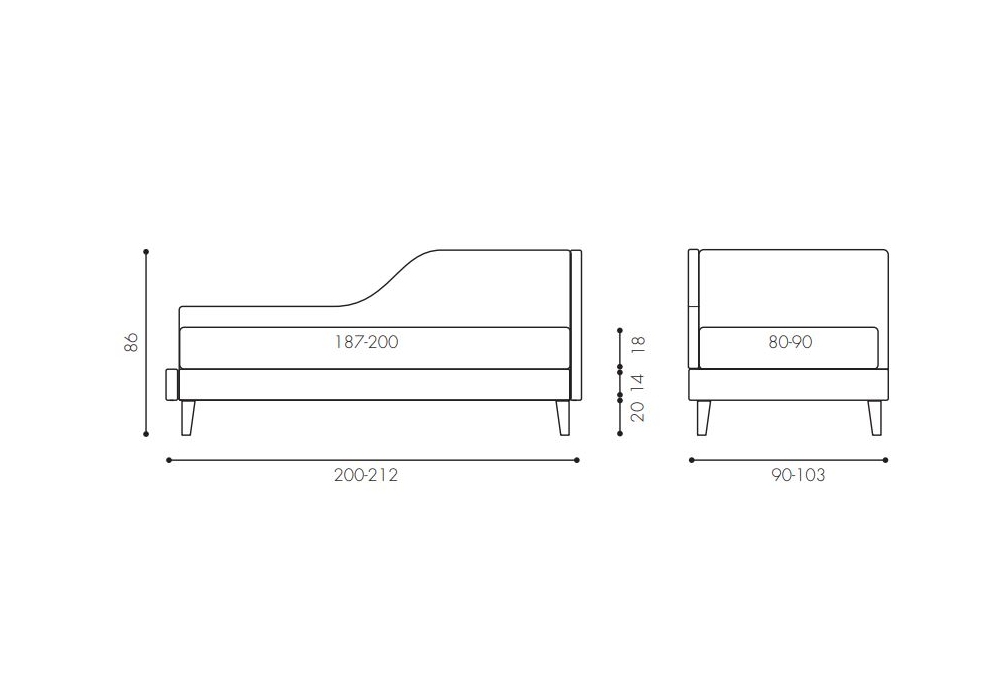 Be-Max Mod.8 designed and produced by Twils is a mother-of-pearl single bed with feet (PIE8DM). Removable cover in different fabrics and colours. Available in different sizes. It can be placed on the right or left.
