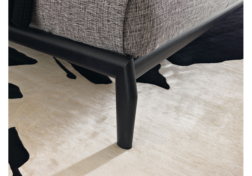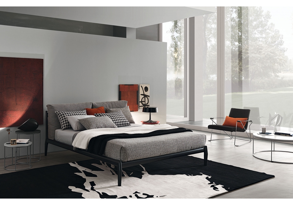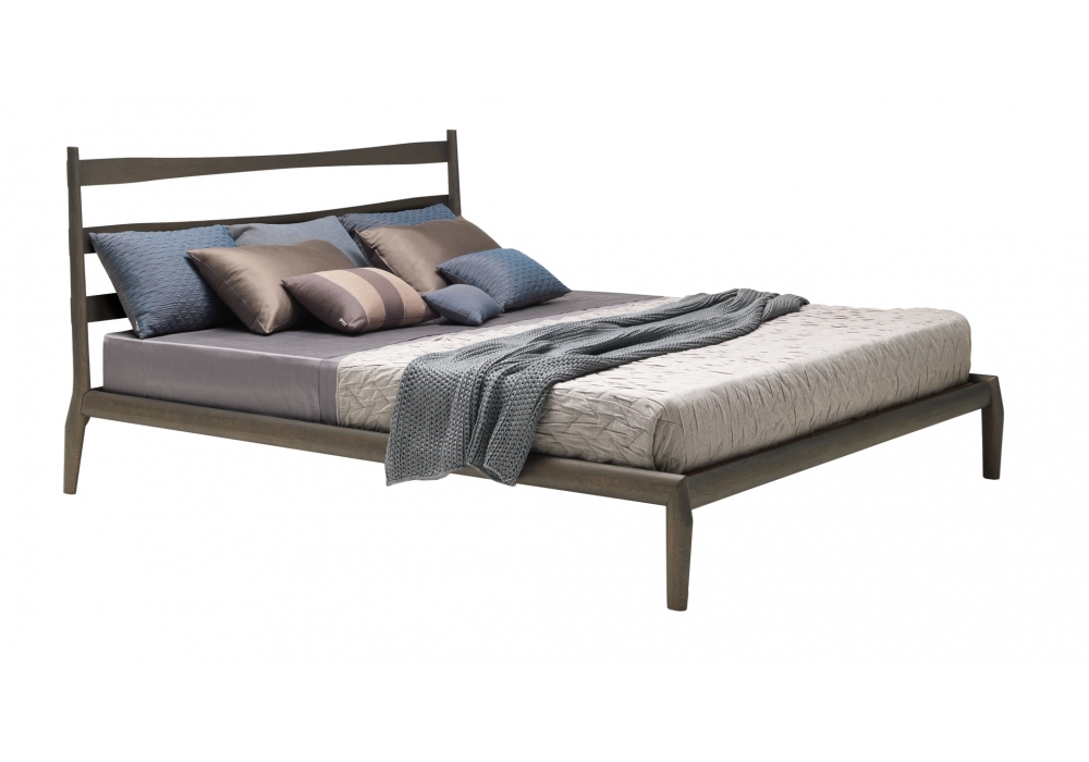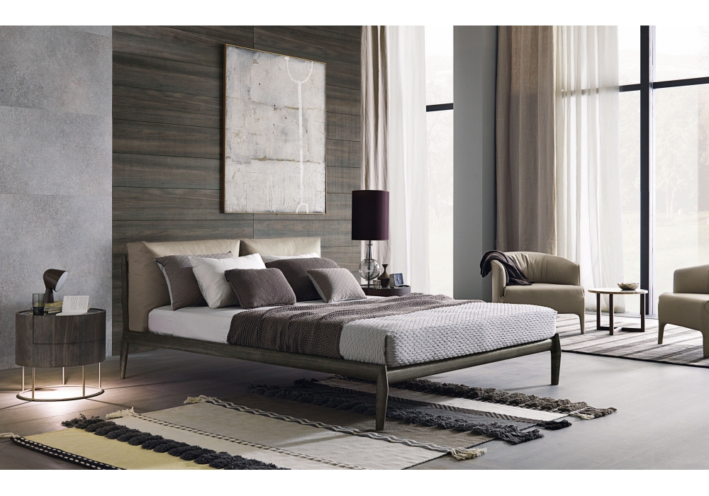 Eladio designed by Allievi & ViganĂ² for MisuraEmme is a bed with fixed bed base made with a structure entirely in shaped and hand-finished solid oak and steel crosspieces for bed base support. Headboard cushions in polyurethane foam and feather mattress. Upholstery in removable fabric or leather with rear laces for anchoring to the headboard.