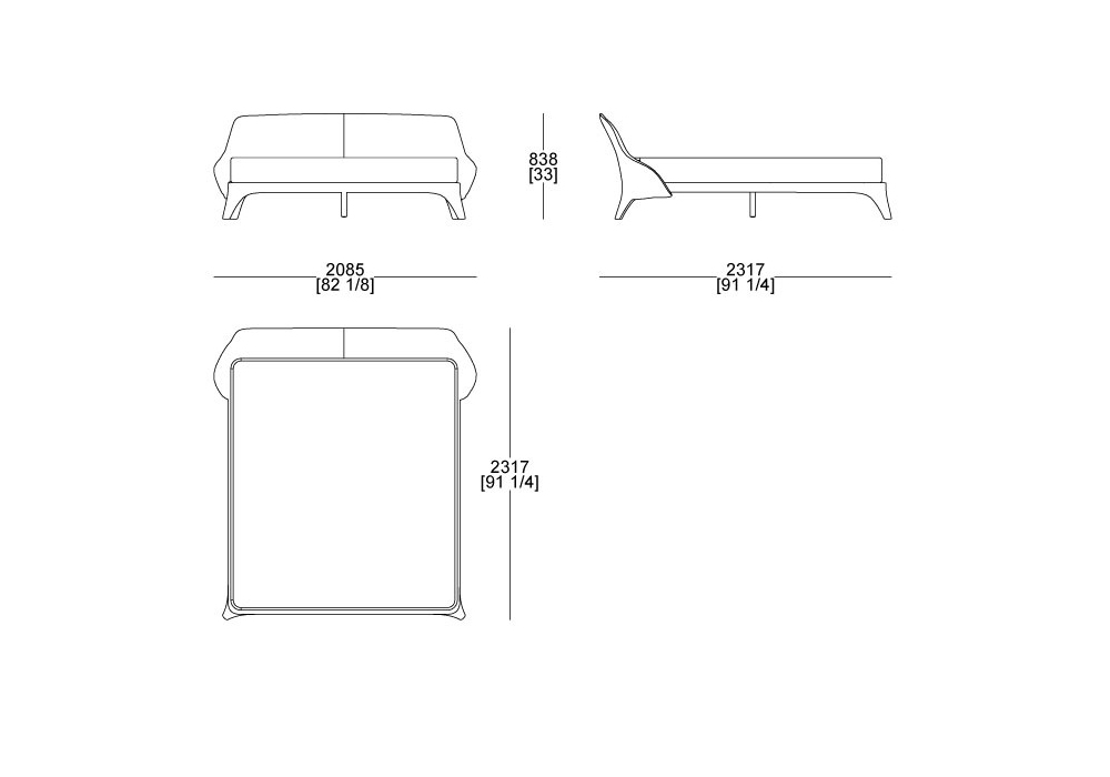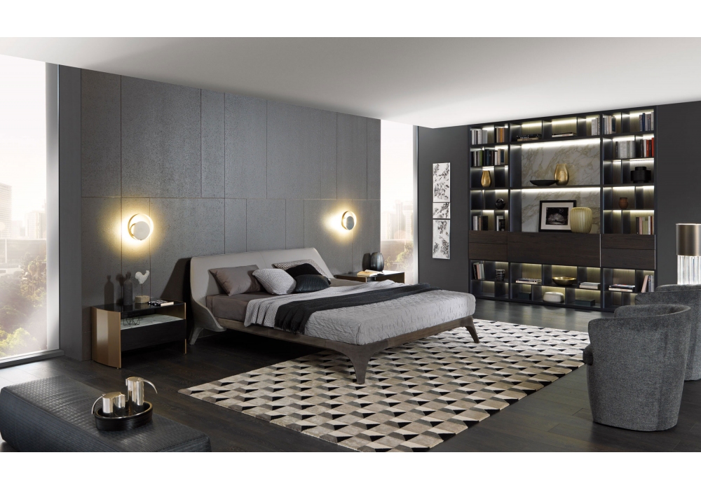 Nice designed by Ferruccio Laviani for MisuraEmme is a bed with a dedicated fixed bed base made with a steel frame, expanded polyurethane foam covered with a mattress in dacron fiber and velveteen. Base with steel frame and wooden slats with reinforcing straps. Upholstery in fabric, eco-leather or leather that can be removed by specialized personnel. On request it is possible to cover the front of the headboard with a different fabric.