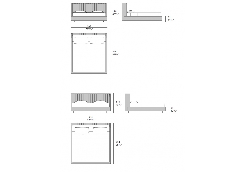 | Dimensions | 195 x 224 x H 110 cm (180 x 200 cm); 215 x 224 x H 110 cm (200 x 200 cm). |