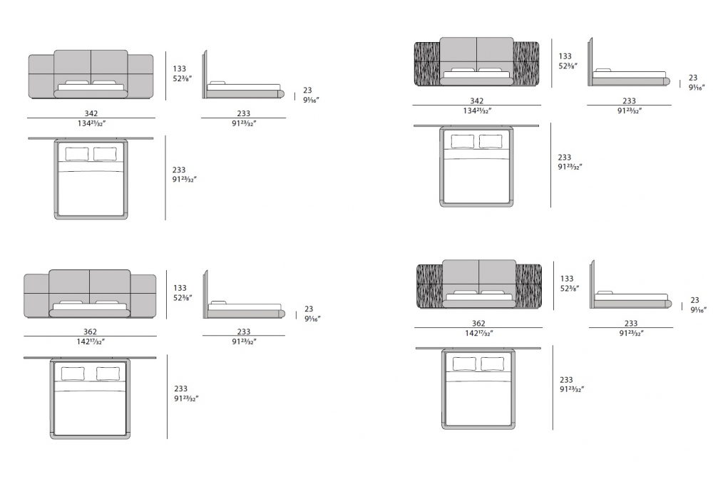 | Dimensions | 342 x 233 x H 133 cm (180 x 200 cm); 362 x 233 x H 133 cm (200 x 200 cm). |