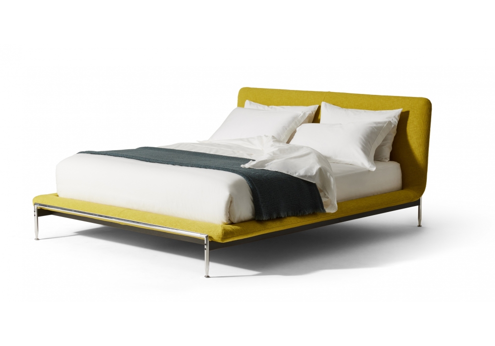 Esosoft designed by Antonio Citterio for Cassina is a bed made with matt anthracite painted metal base, tubular structure and fabric covering. Padding in expanded polyurethane with a percentage of polyols derived from biological origin and panel in Soundfil®, lining in recycled PET wadding, removable cover.