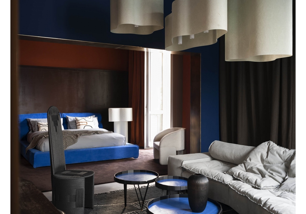 Miami Soft designed by Paola Navone for Baxter is a bed with bed frame with four side bands in plywood and fir honeycomb. Headboard structure in plywood and fir honeycomb. Headboard with movable rolls in polyurethane foam filling. Feet in semi-gloss black-stained beech. Available in soft leathers only. A mattress can be purchased separately.