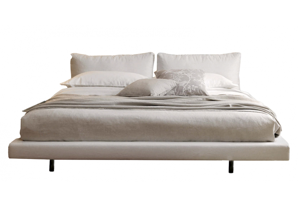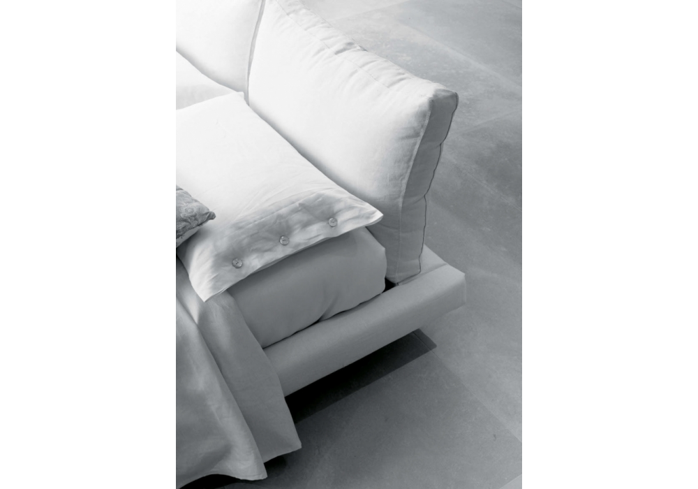Ozium designed by Roberto Gobbo and R&S désirée for Désirée is a bed with structure in solid wood and plywood with padding in polyurethane with different densities, covered with a protective fabric lining. Cushion holder and feet in polished chromed aluminium. The upholstery is in completely removable fabric or leather, with visible tone-on-tone stitching for the fabric upholstery of the headboard cushions.