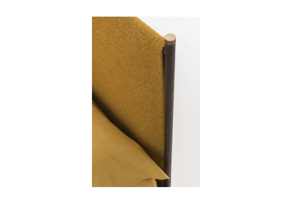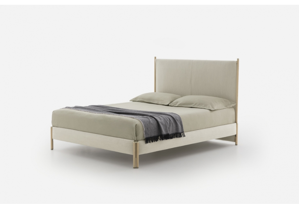 Bricola designed by Raffaella Mangiarotti for Pianca is a bed with uprights made of solid walnut wood in Canaletto finish or in solid ash painted Essenza or lacquered and decorative metal tips. Structure in two versions, sommier or bed frame, with particle board panels padded with expanded polyurethane. Removable cover is made of fabric. Available with slatted base or container.
