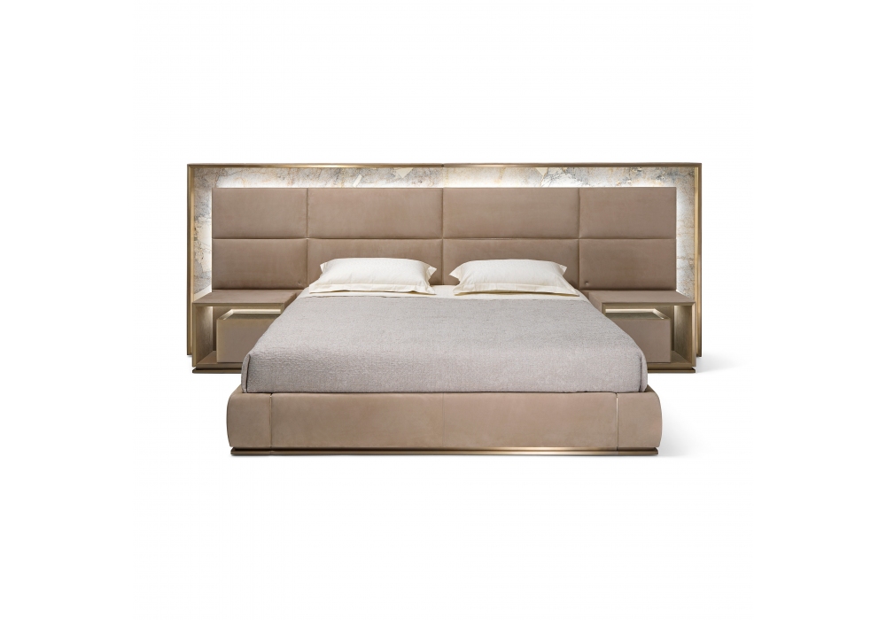 Aubade designed by Alessandro La Spada for Visionnaire is a bed with headboard made of rectangular wooden panels padded and covered in leather or fabric, separated by stainless steel inserts. The perimeter frame is embellished with recessed marble inserts with LED courtesy light. The bed frame is made of plywood padded with polyurethane and covered in leather or fabric with base and metal parts in stainless steel. Aubade is available in different models and finishes.
