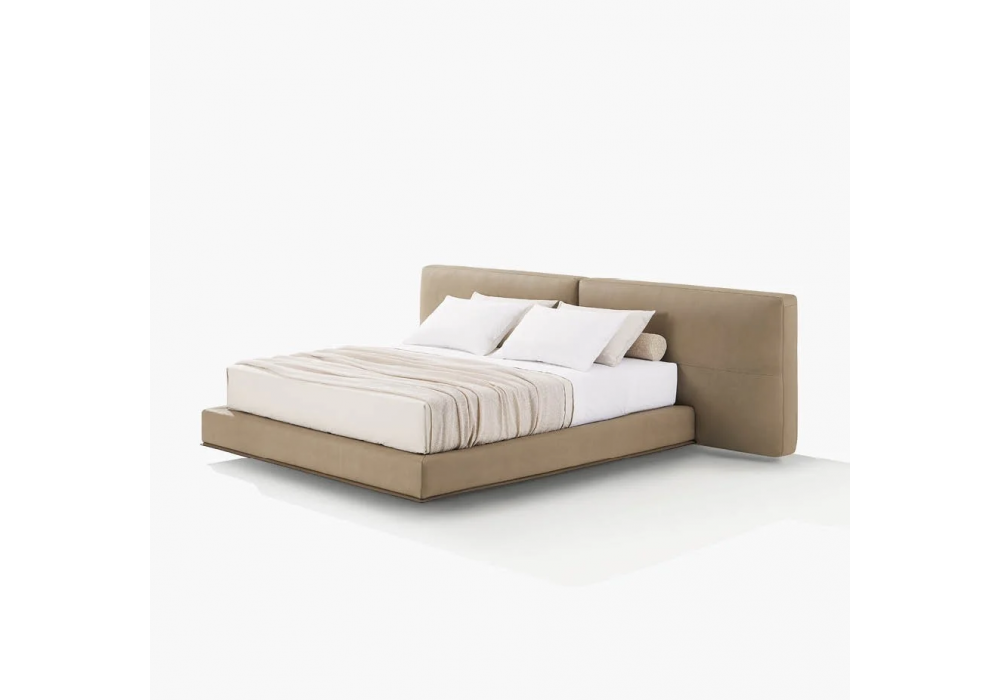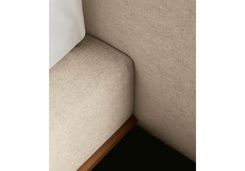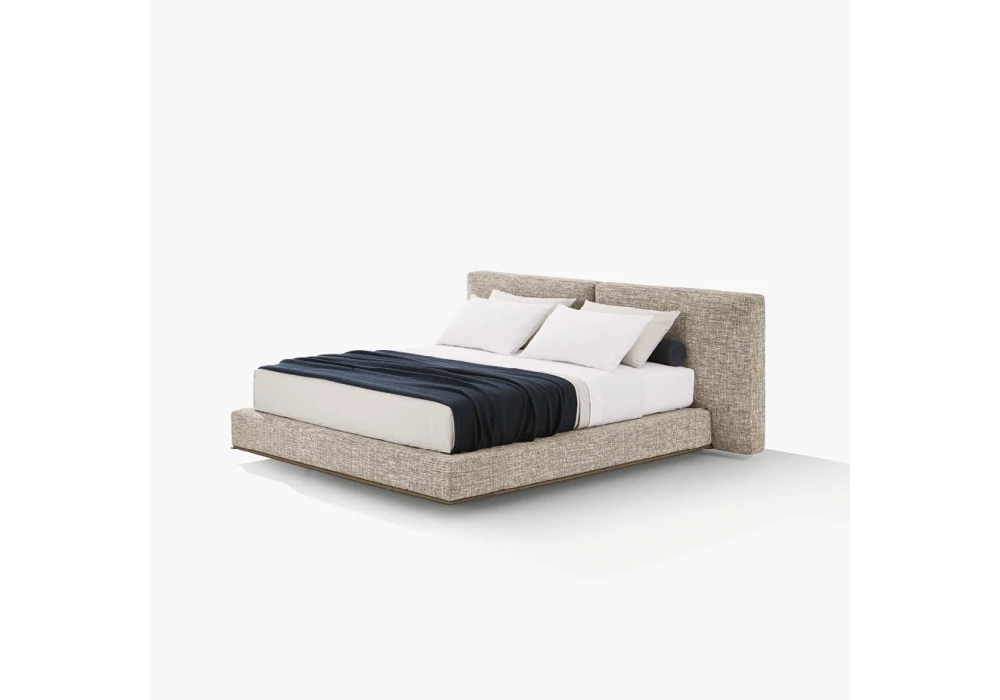 Brera designed by Jean Marie Massaud for Poliform is a bed with headboard in wood and wood-derivatives with padding in multi-density flexible polyurethane, pre-cover in polyester fibre and cover in removable fabric or leather. Bed frame in solid wood with padding in single-density flexible polyurethane, precover in polyester fibre, perimeter frame in hide, final cover in removable fabric and leather or in non-removable hide in the sample colours. Feet in mat brown nickel painted metal or, on request, in mat and glossy metal light sheer or dark sheer. In the master version feet in plastic material. Available in different sizes.