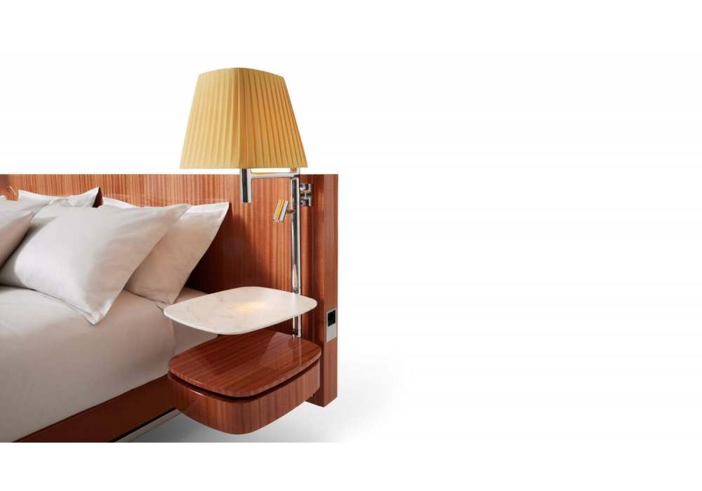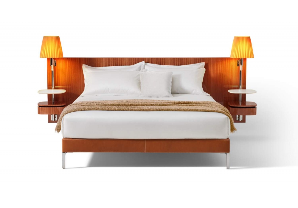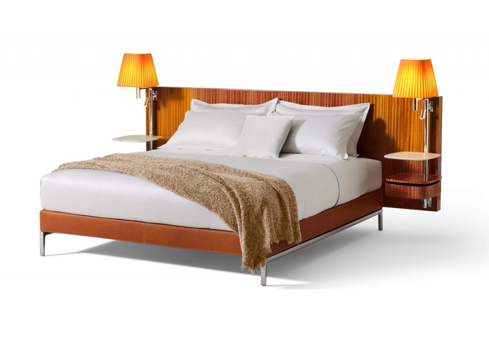 SYCOMORO WOOD: Bed with headboard in matt sycamore; Voyage Natural leather bed frame; chrome bed frame and lamps; Ivory colored lampshade; shelves in matt Calacatta marble; bedside tables in matt sycamore.