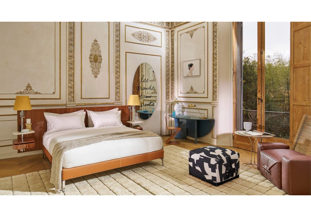 MAHOGANY WOOD: bed with polished mahogany headboard; Voyage Natural leather bed frame; chrome bed frame and lamps; Peach colored lampshade; shelves in matt Calacatta marble; polished mahogany bedside tables.
