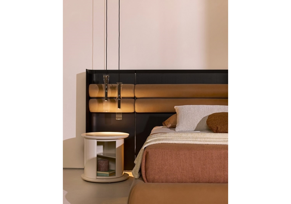 Sunrise designed by Studiopepe for Gallotti&Radice is a bed in non-deformable foam polyurethane in different density and polyester fibre. Curved black open pore stained freestanding headboard with headrest in non-deformable foam polyurethane. Also available opaque lacquered wooden version in the colours “Rosso Persia”, “Grigio Londra”, “Nero Giza”, “Bianco Camargue”, “Verde Provenza”, “Blu Pacifico”, “Bordeaux Etruria”, “Rosa Jaipur” and “Sabbia del Nilo”. Available covered by fabric or leather as per samples. Black nickel-plated metal details. Wooden slats included. Removable bed frame. Removable headrest excluding Cat. L1, L2.