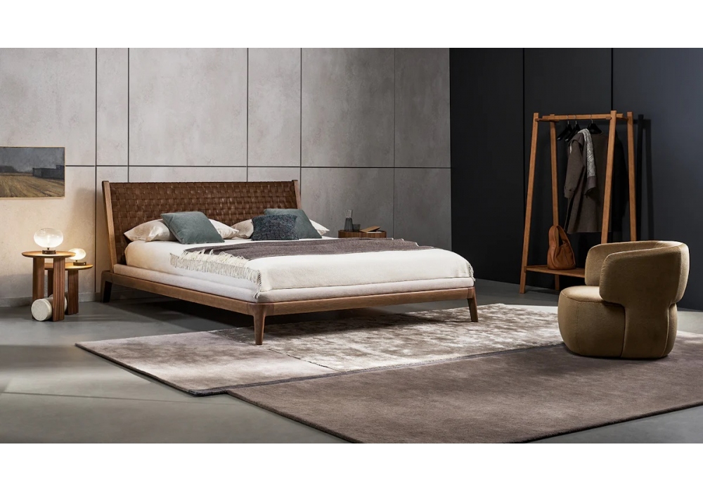 Honeymoon designed by Mauro Lipparini for Bonaldo is a bed characterized by a solid wood headboard, shaped polyurethane foam padding, solid wood bed frame and feet, internal structure with painted metal supports and plates. Headboard upholstery in woven full-grain leather, bed frame covered in fabric.