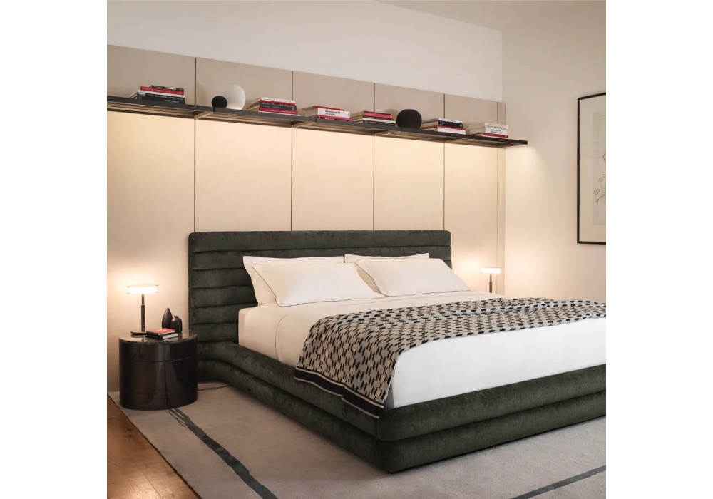 Wellen designed by Toan Nguyen for Karl Lagerfeld Maison is a bed with headboard and bedframe upholstered with cover in leather or fabric. Available in different sizes.