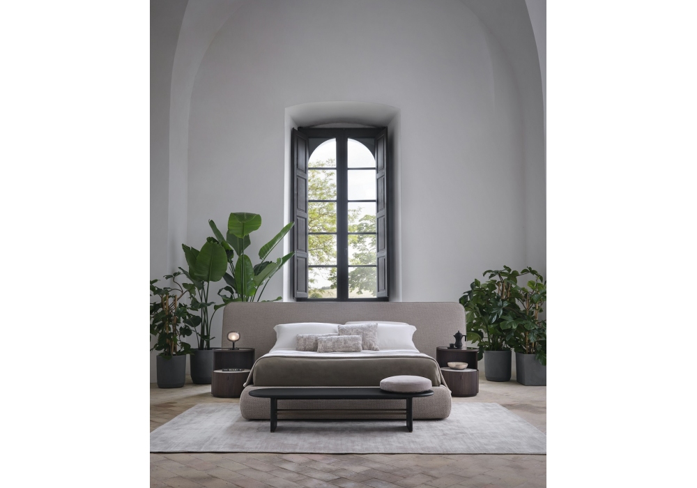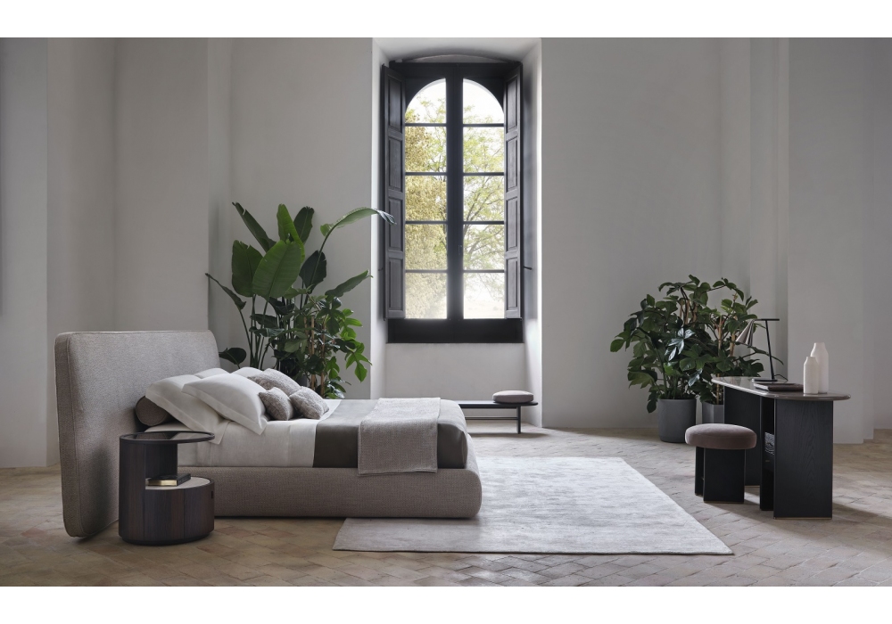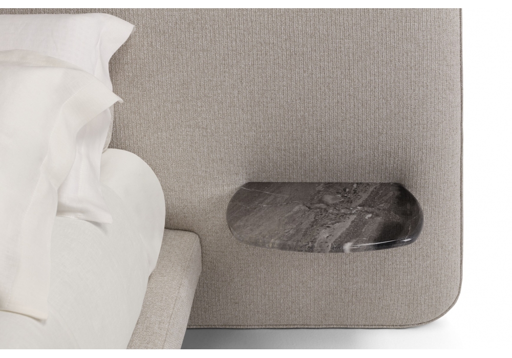 Nube Royal designed by Antonio Lanzillo for Conte Casa is a bed with completely removable fabric or leather upholstery. Marble tables. Available in different finishes and dimensions.