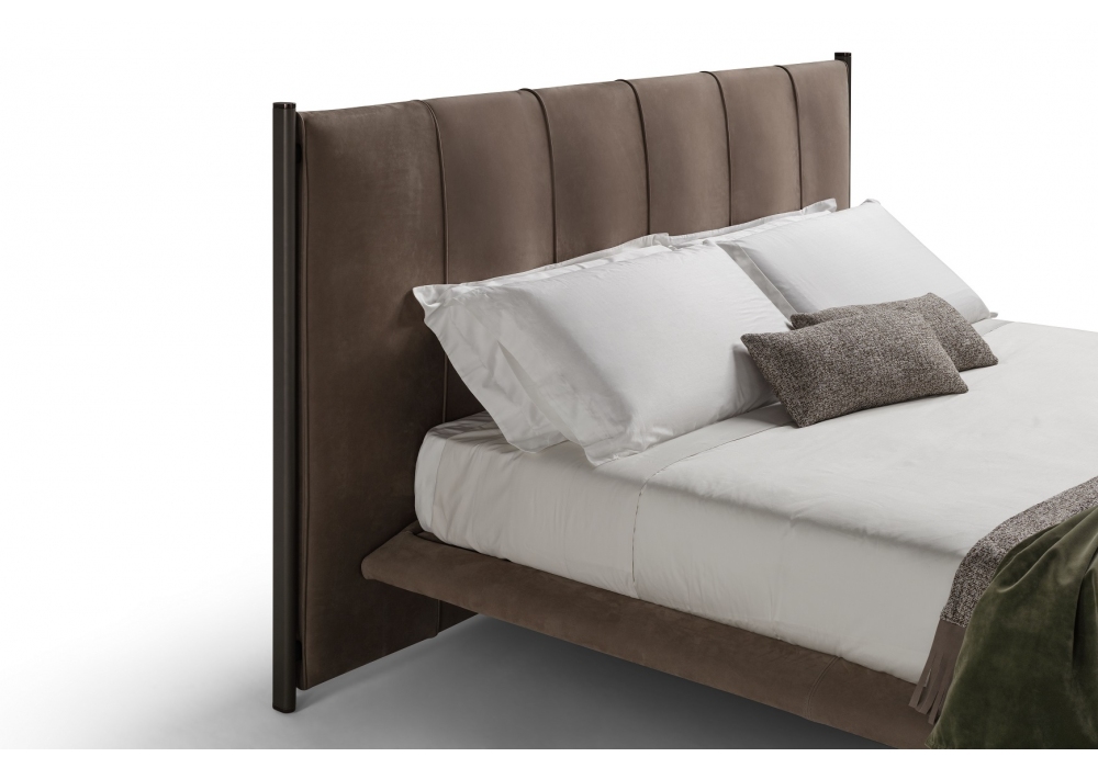 Levante designed by Dainelli Studio for Conte Casa is a bed with partially removable fabric or leather upholstery. Bronze finish rods and feet with Nickel detail. Available in different finishes and dimensions.