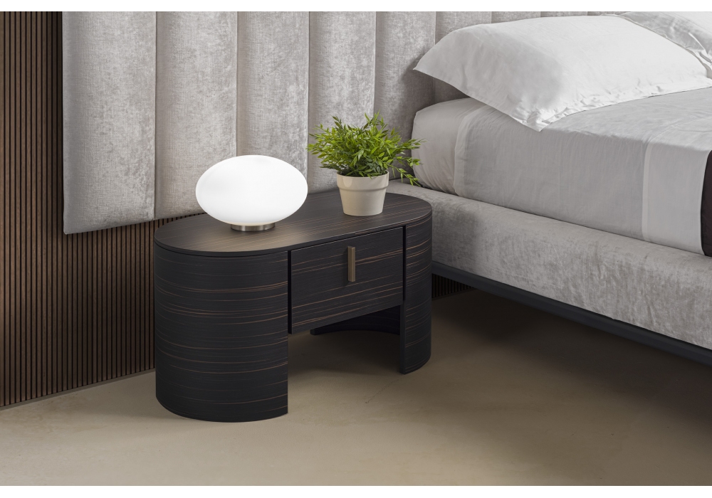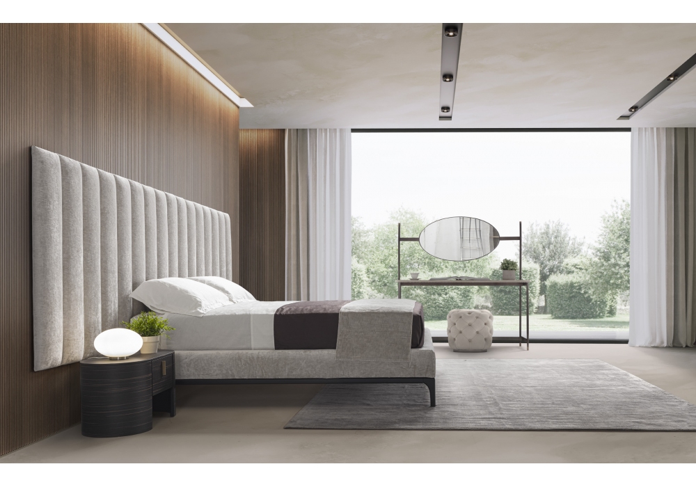 Michelangelo designed by Joe Garzone for Conte Casa is a bed with a headboard structure anchored to the wall in plywood, polyurethane foam padding and fabric or leather upholstery.