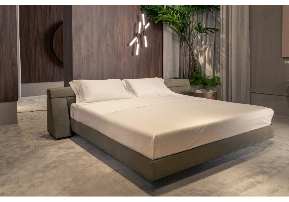 Duomo designed by Derek Castiglioni for Casamilano is an upholstered bed with a motorized headboard with a height-adjustable headrest via remote control. Feet in walnut-stained beech. The upholstery is in non-removable fabric or leather.