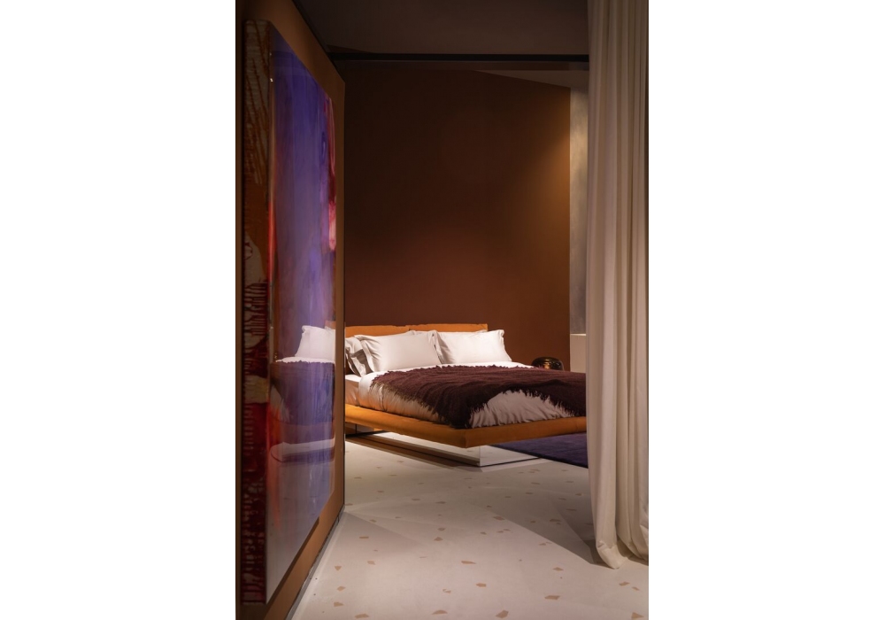 Aura designed by Hannes Peer for Baxter is a bedwith headboard and bed frame in fir and poplar wood. Padding in differentiated density polyurethane foam. Base in aluminum with polished or lacquered finish. Headboard back finished in leather. Upholstery in soft leathers only. Available in different sizes and, on request, with additional bedside table and side table.