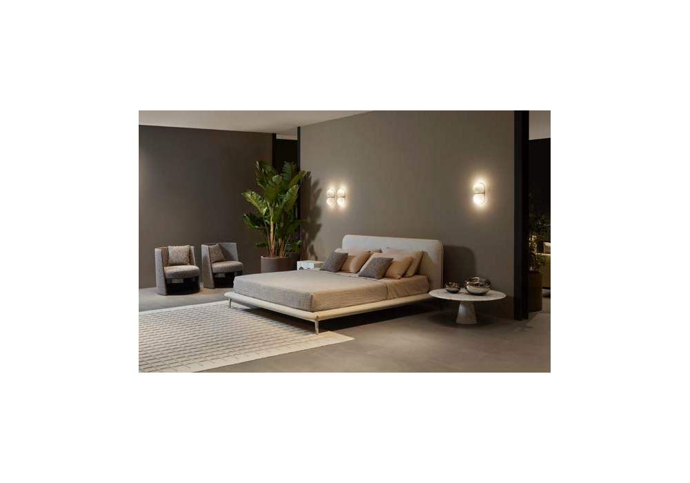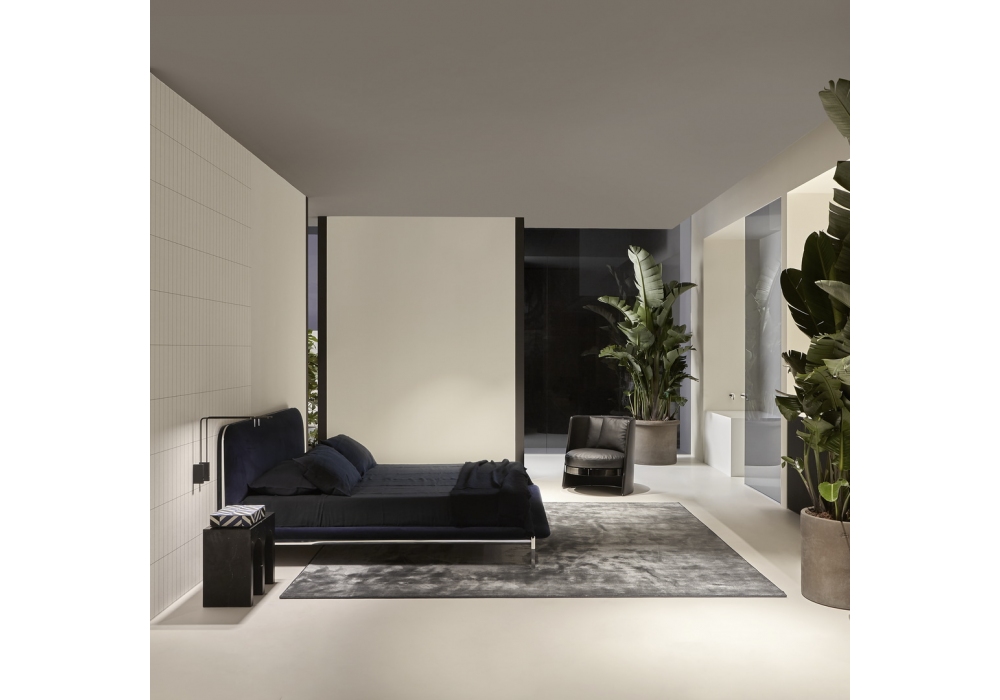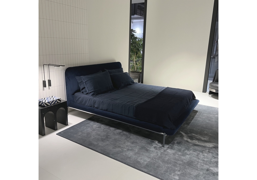 Sofi designed by Carlo Colombo for Antonio Lupi is a bed with a Brill aluminum base, headboard trim, and feet. The internal structure of the headboard and bed frame is made of plywood and solid fir. It is padded with non-deformable polyurethane foam in varying densities and upholstered in non-removable fabric or leather. The bed base features a black painted metal frame and solid beech slats.