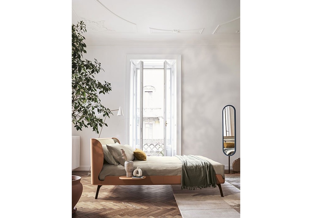 Gabri designed by Matteo Zorzenoni for Bolzan is a bed with frame in RAL 9011 graphite black finish and non-removable external upholster - available in leather in the colors 32, 49, 84, 880. The internal headboard is upholstered in fabric. Gabri, with its enveloping, sensual headboard lines and compact dimensions, is perfect for both large and small spaces.