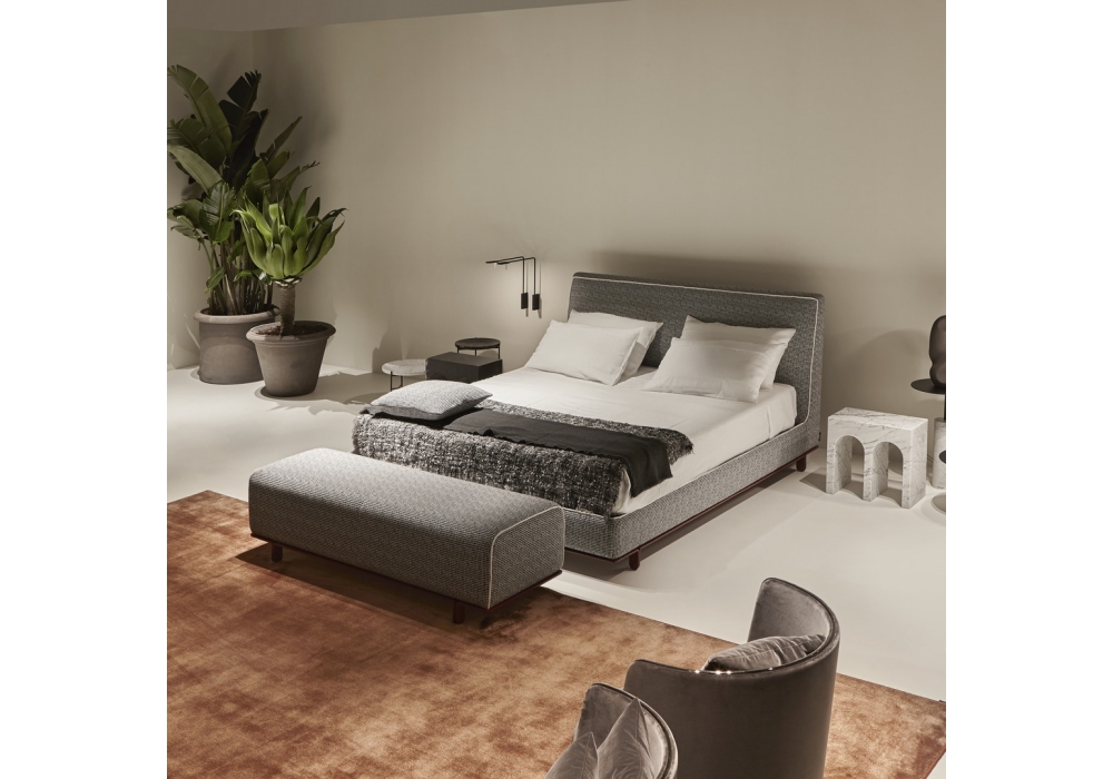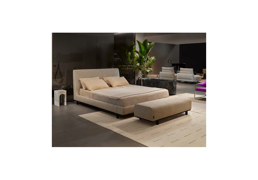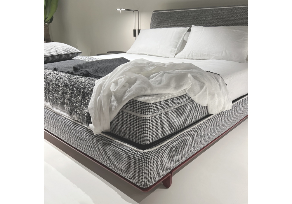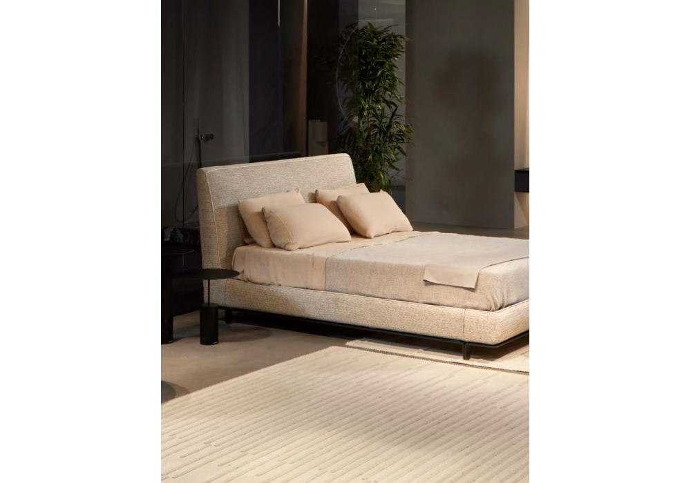 Ginevra designed by Carlo Colombo for Antonio Lupi is a bed with a stove-enameled metal base and non-deformable polyurethane foam padding. Non-removable fabric or leather upholstery. The bed base features a black painted metal frame and solid beech slats.