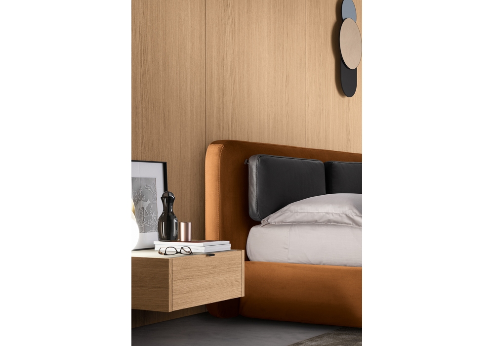 Echo designed by Kico is a bed with exposed padded headboard cushions and a frame composed of a padded bed frame in fabric or leather. It can be equipped with various types of feet.