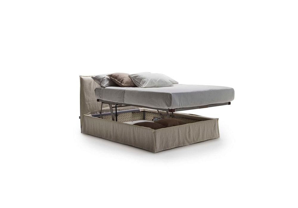 Naxos designed by Milano Bedding is a fabric-upholstered bed, characterized by a lived-in and functional aesthetic, it provides a cozy solution for the bedroom environment.The most distinctive feature of the Naxos bed is the "Komodo" storage system, an ingenious mechanism that allows you to raise both the base and the mattress. This simplifies making the bed and provides effortless access to the storage space—a detail that makes the Naxos the perfect choice for those seeking everyday practicality and comfort. Designed for modern and contemporary interiors, this bed helps maintain a sense of order thanks to its hidden storage compartment.