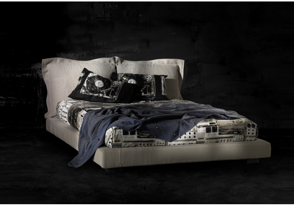 Nebula Five is the bed designed by Diesel with Moroso. Nebula Five, with its soft-textile padding, reflects the characteristics and finishes of the large Nebula Nine sofa. Stress-resistant polyurethane foam and polyester fibre on wood frame. Feet in ash.