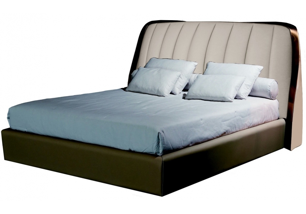 Dama designed by Rugiano is a bed upholstered in leather or fabric in different finishes. Available in various sizes. Bronzed brass details. Mattress not included.