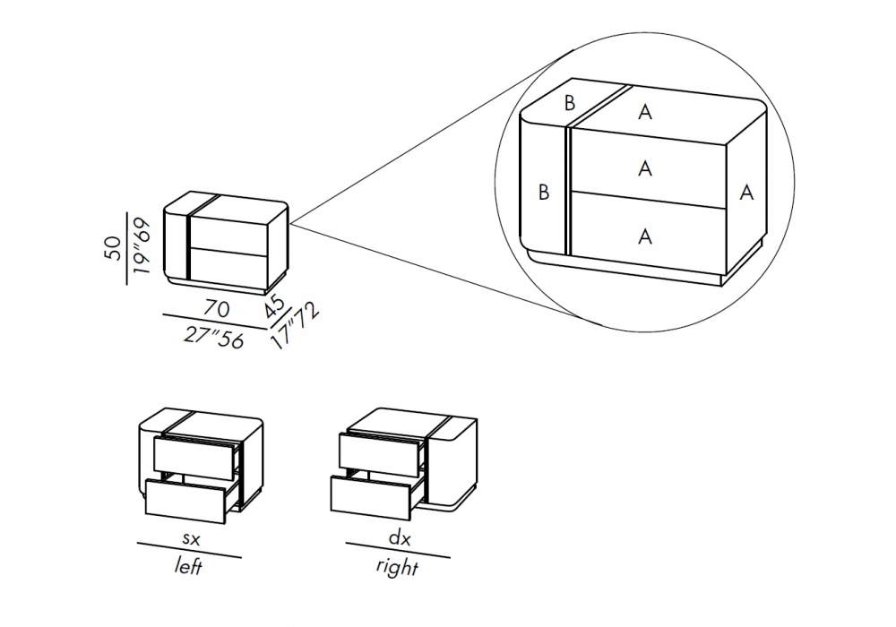 Dimitri 70 designed by Andrea Parisio for Meridiani is a is a bedside cabinet with wooden frame. Available in matt, glossy lacquer or two-colored matt or glossy lacquer finish. Wooden inserts in bronzed brass lacquer.