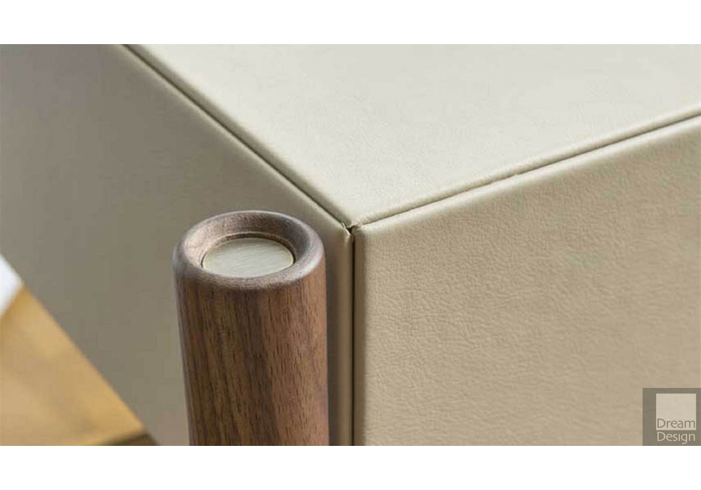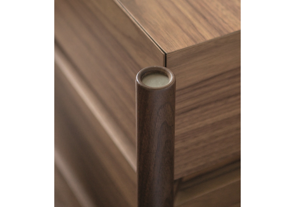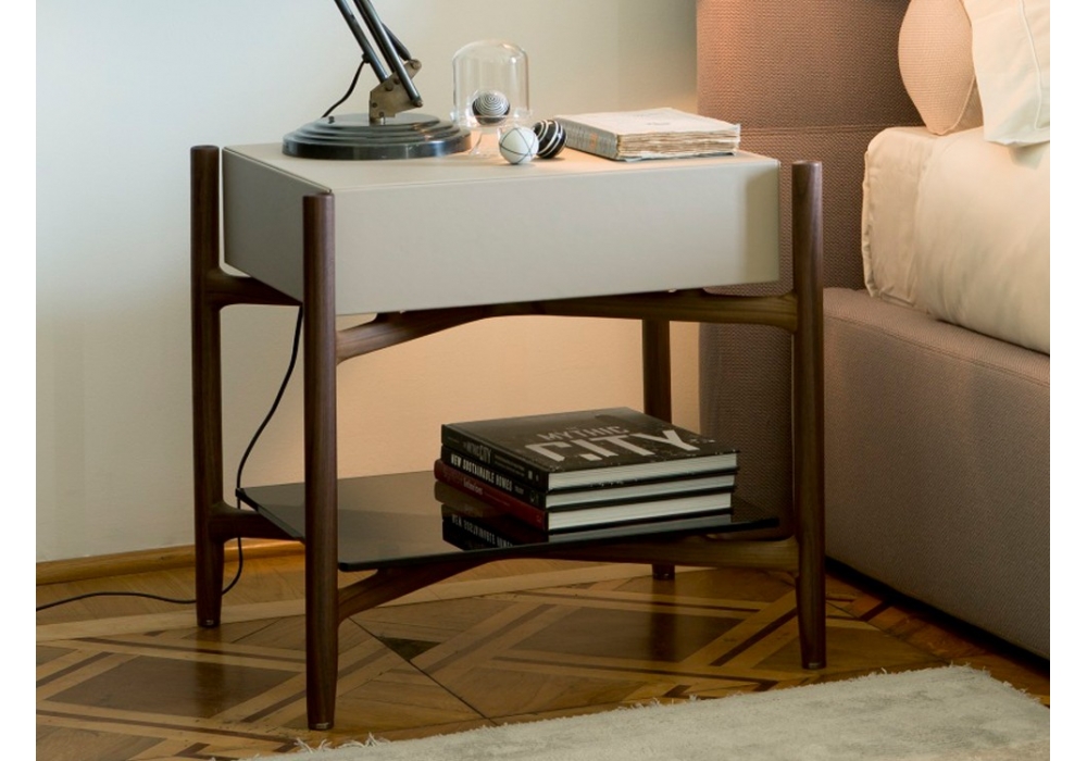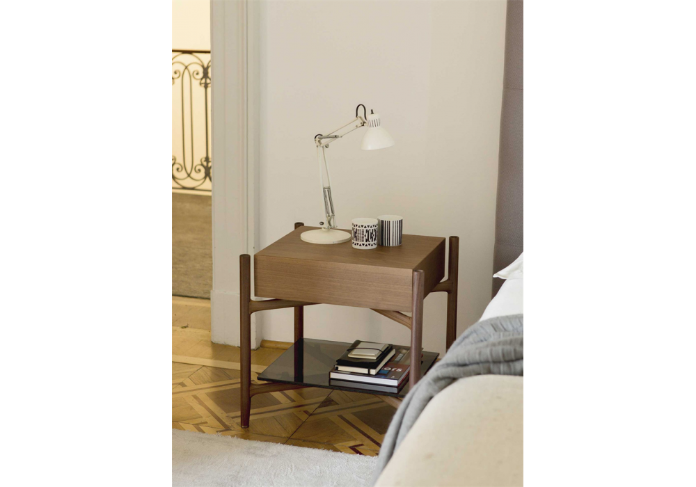 Regent 2 designed by T. Colzani for Porada is a bedside table with frame in solid canaletta walnut. The drawer with soft closure is upholstered in leather. Bottom shelf in smoked glass. Also available in the version with wooden drawer.