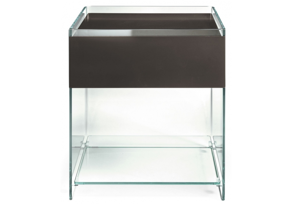 Dino designed by CRS Fiam is a bedside cabinet with curved glass structure with drawer made of lacquered wood in white, black or brown-grey finish and matching glass front. Upon request it is available with extralight glass structure and white drawer, smoked glass and black drawer or bronze glass and brown drawer.