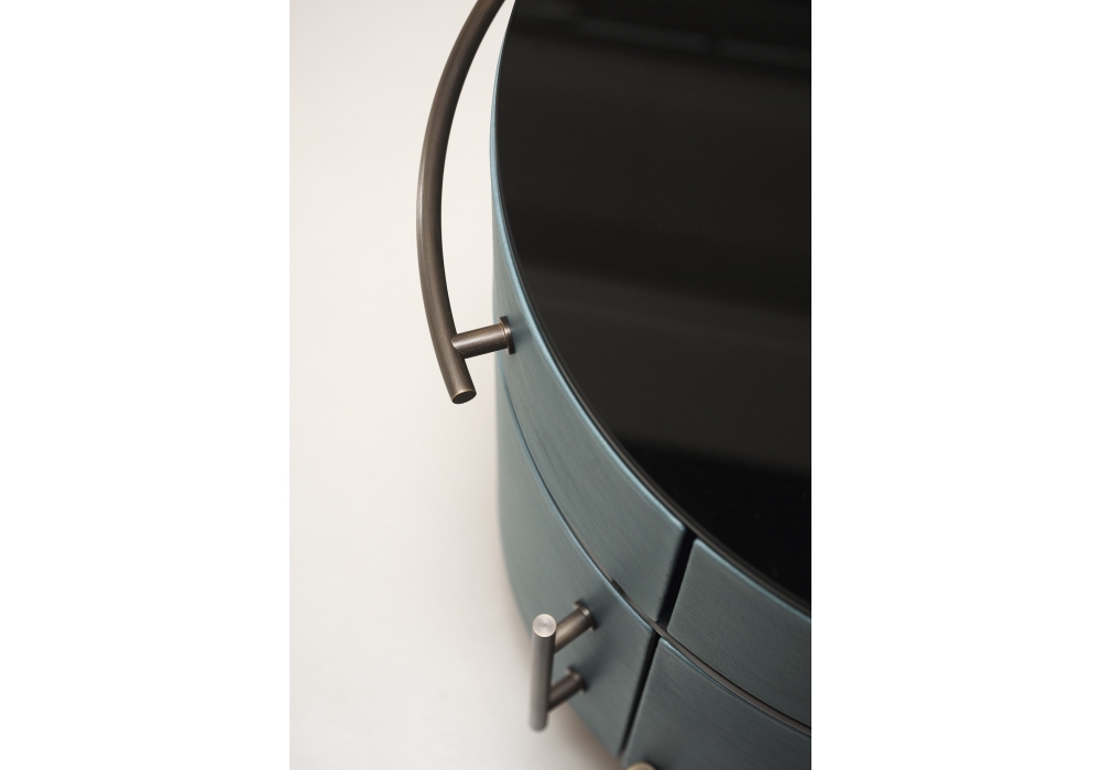 Plissé designed by Draga&Aurel for Baxter is a round bedside table with base, handle and details in burnished brass with matte varnish. Structure in curved plywood and MDF, matt black stained oak veneer. Lining in natural maple. Front door and drawer covered in leather. Black back-lacquered glass top.