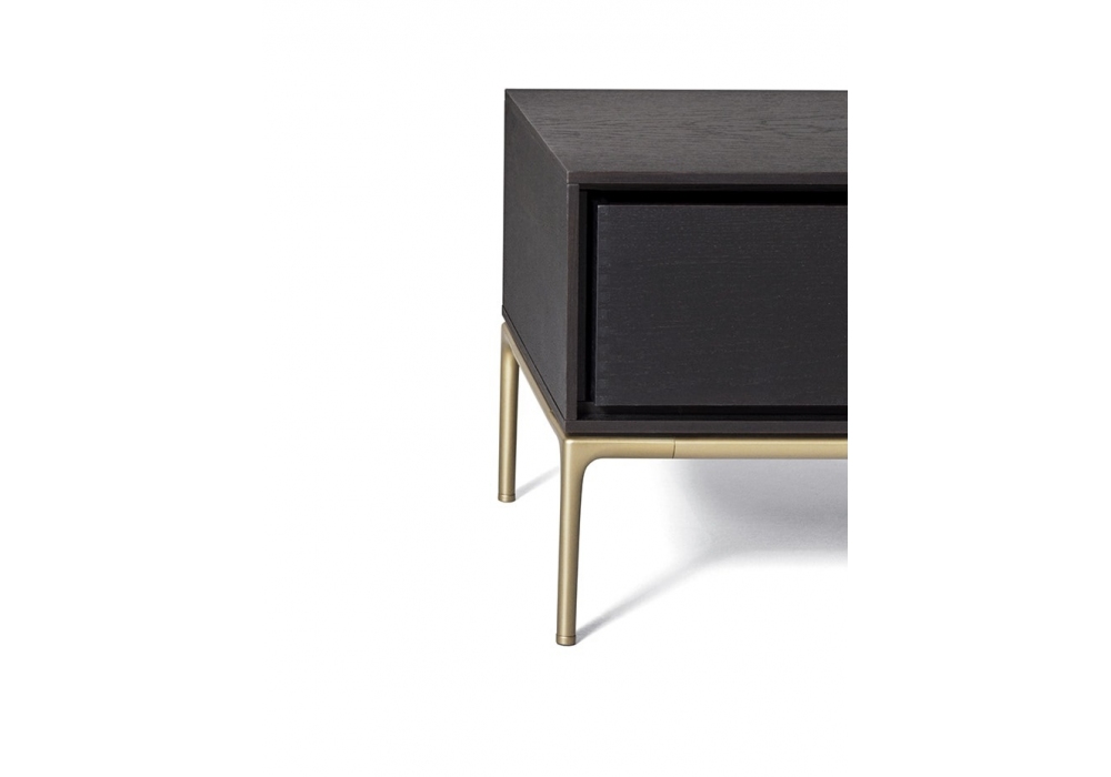 Time Trip for Memoriesdesigned by Time & Style for DePadova is a bedside table with one drawer made with structure in smoked oak MDF and feet and crosspieces in aluminum painted in brass or burnished brass.