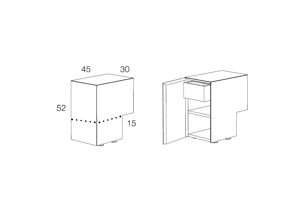 Formosa Accucciata designed by DSH for Minotti Italia is a bedside table composed of a hinged door and an internal drawer. Wall fixing and adjustable feet. Embossed finish available in different colours and also in gold or silver leaf. Available with right or left opening.