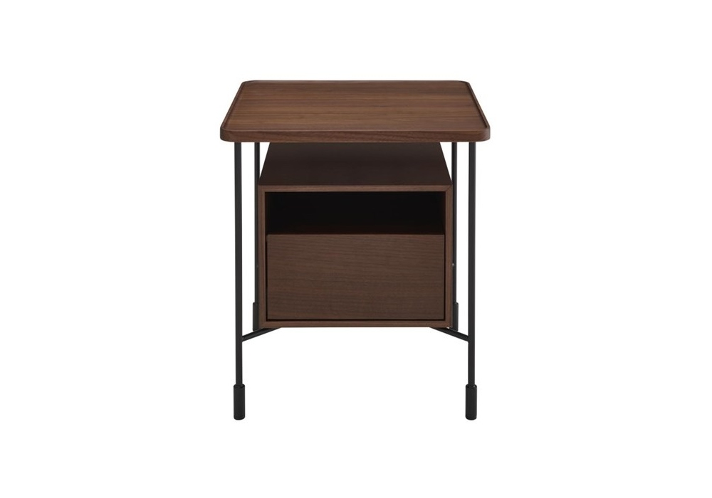 Passepartout designed by Philippe Nigro for Ligne Roset is a bedside cabinet with metal structure, drawer and top in dark tone walnut.