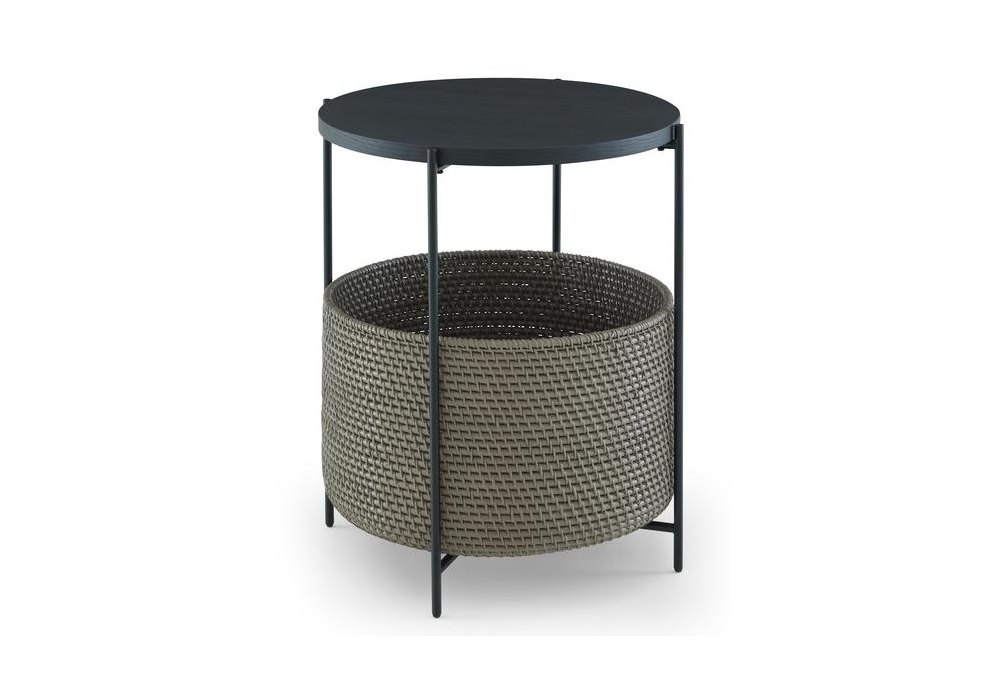 Cestino designed by Evangelos Vasileiou for Ligne Roset is a bedside cabinet with structure in satin black lacquered steel, MDF top finished in satin black-stained ash veneer and woven rattan basket (Ø 40 cm), available in 2 finishes. One of the legs may be removed to enable the basket to be pulled out or pushed back in.