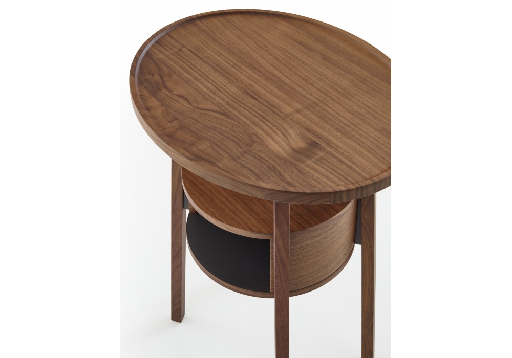 Episode designed by Marie Christine Domer for Ligne Roset is a bedside cabinet with structure, top and base in natural varnished solid American walnut. The edging of the chest is in walnut-veneered multi-ply; the interior and crosspieces are in gris plomb (lead grey) lacquer. With or without push-pull door.