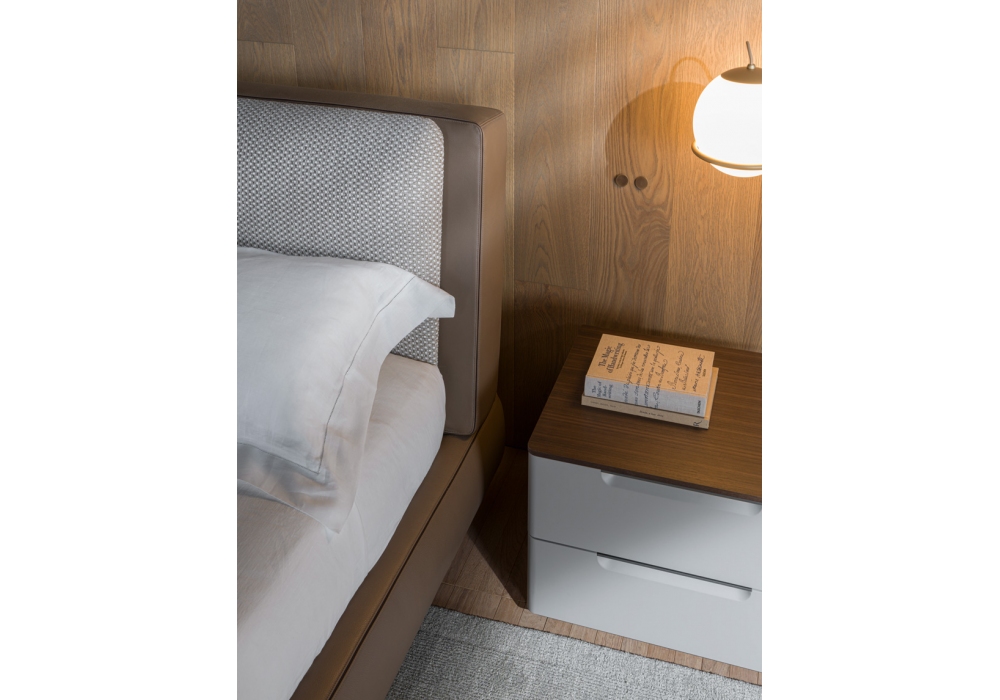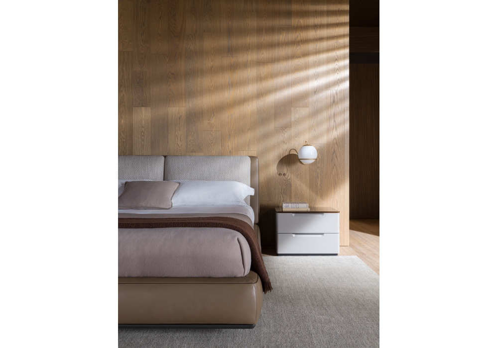 7070 designed by Rodolfo Dordoni for Molteni&C is a bedside table with matt lacquered structure and top in Eucalyptus wood or marble. The pull-out tray of the bedside table is made of eucalyptus with a Flutes glass top, it is also possible to insert a bottom in dark brown Eco Skin. Available in different finishes and models.
