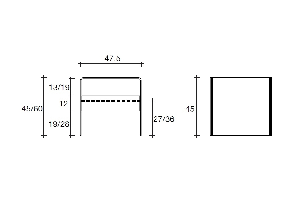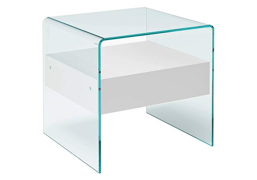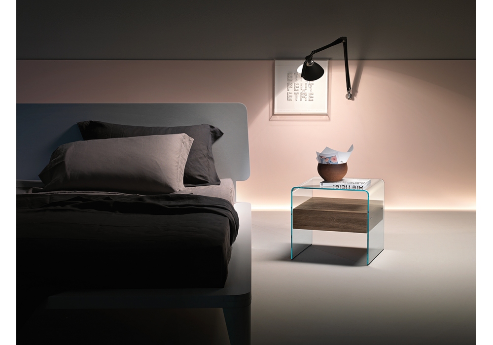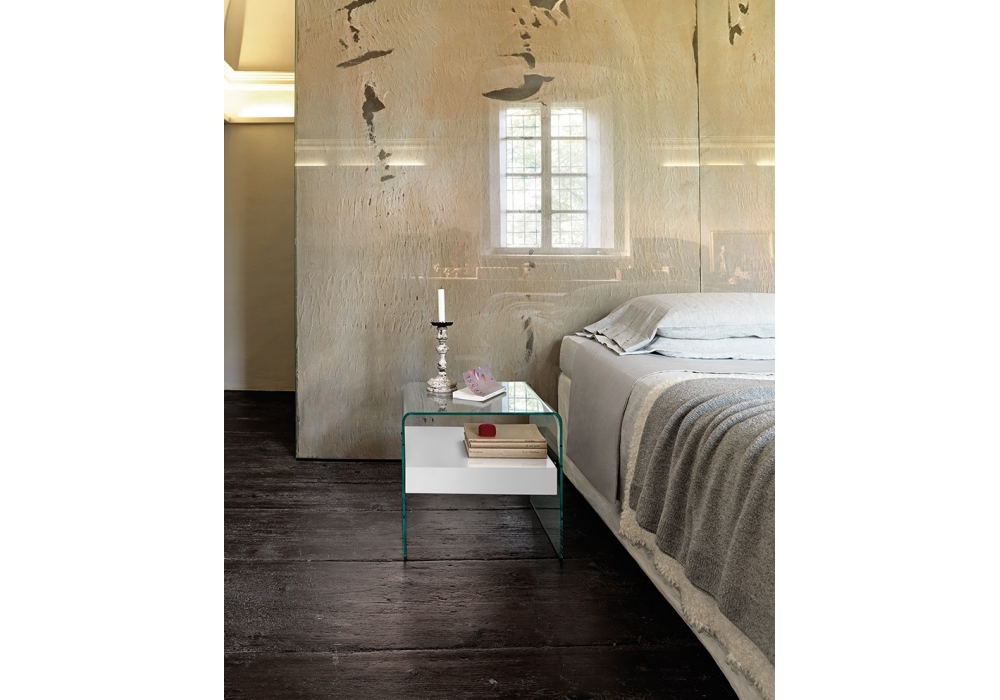 Rialto Night designed by CRS Fiam is a bedside table in curved 8 mm glass. Available with glass shelf or with drawer in tobacco oak or white lacquered.