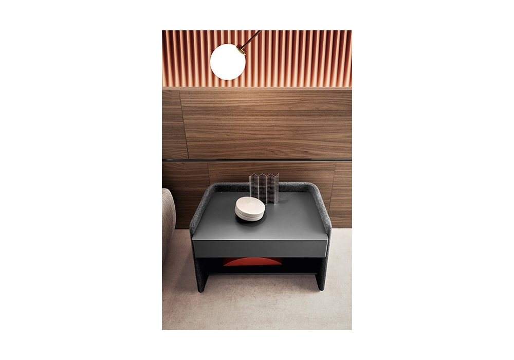 Chloé designed by Emmanuel Gallina for Pianca is a bedside table made with a structure with curved stratified panels covered with micro-padding in fabric, leather and synthetic leather. Drawer and shelves with matt lacquered MDF panels. Available in different finishes and dimensions.